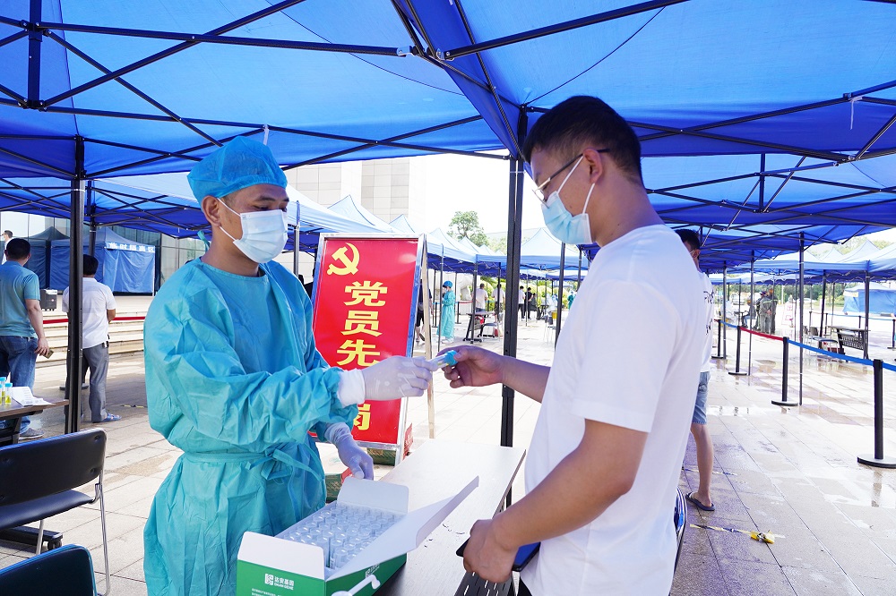 近期阳江迎来今年以来最强的持续性暴雨天气,这给全员核酸检测工作带来一定影响。为了应对恶劣天气,确保生产、防疫工作两不误,公司第一时间成立工作领导小组,制定详细的工作实施方案,召开疫情防控部署会议,争分夺秒做好各项前期准备工作。在时间紧、任务急的情况下,采购人员紧急购入60顶帐篷及雨衣雨具,安保人员加班加点、冒雨搭建检测通道。采样当天,公司党员先锋队、志愿者等工作人员积极协助医务人员,做好测温、扫码、采样等工作,整个环节运转高效,仅历时3个半小时便完成全员采样工作。