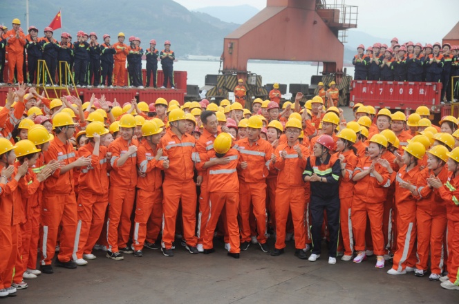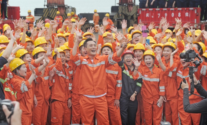 青拓物流5#、6#、7#码头在热烈气氛中盼来了主持人张蕾和嘉宾刘烨。门座式起重机拔地参天,货运轮船如海上堡垒,以白马河荡漾水波为背景,员工们身着工服簇拥着明星嘉宾,橙红鲜亮,深蓝沉稳,汇成色彩与歌声的海洋。放声高歌,振臂挥舞,以歌言梦,“奋斗才会有幸福,劳动最风流”,青拓人吹响时代号子;“富饶神州我的故乡,东西南北绚丽的舞台”,青拓人为新时代点赞!